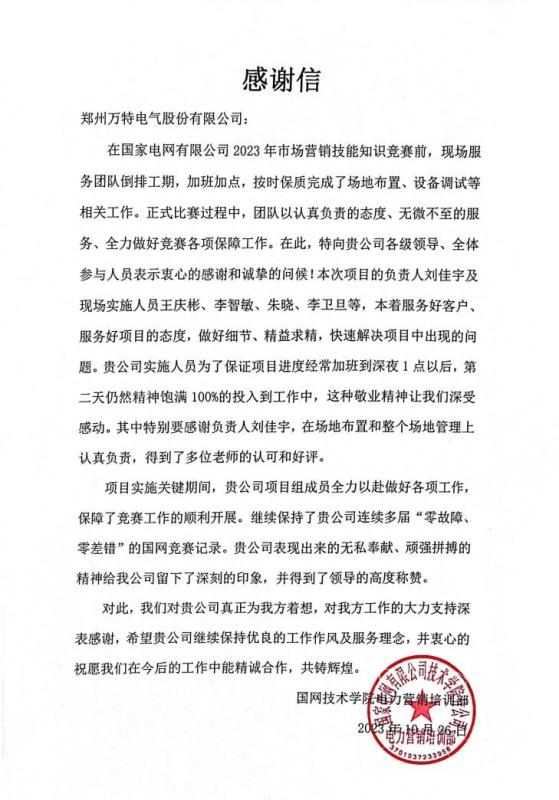 2023年10月,國家電網(wǎng)公司2023年市場營銷技能知識競賽在國網(wǎng)技術(shù)學(xué)院落下帷幕。在這場盛大的賽事中,我公司以卓越的產(chǎn)品性能和精準(zhǔn)的服務(wù)支持,保持了產(chǎn)品“零差錯、零故障”運(yùn)行,贏得了業(yè)界和評委們的一致好評。