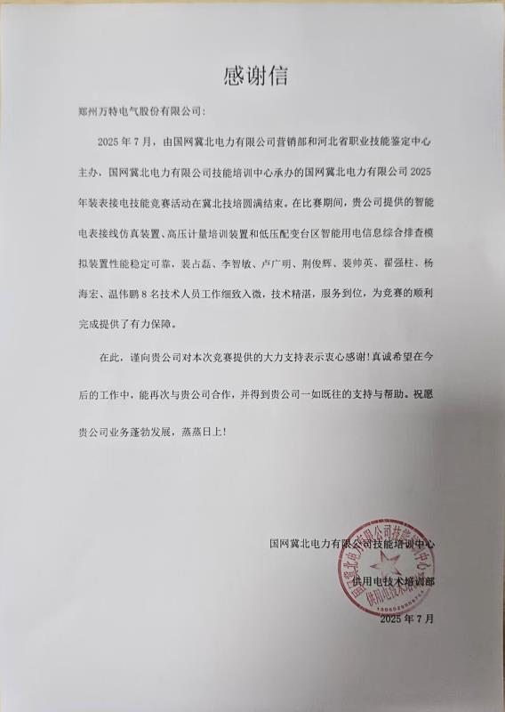 這一封封來自國網(wǎng)省級單位的感謝信,既是對萬特技術(shù)實力的權(quán)威認證,更是對公司在電力競賽標準化服務(wù)領(lǐng)域的深度認可。從山西的采集運維到湖北的智能電表接線,從河南的反竊電分析到冀北的省級技能鑒定,四省差異化賽事需求的成功交付,是基于公司近二十年服務(wù)國家級賽事的經(jīng)驗積淀,印證了公司在各類電力技能競賽中具備相當規(guī)范化、標準化的專業(yè)能力。