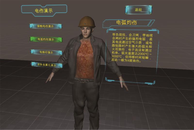 電的危害以VR 的形式展示人體觸電的形式、不同觸電電流對身體的影響、不同電傷形式對人體產生的危害和 人體在各種環(huán)境下人體電阻的變化趨勢等,通過虛實相互結合、語音圖片相互襯托、特效渲染,將枯燥的文 字轉化為動態(tài)的展示,讓學員充分認識、理解觸電的原理、電傷的原理和人體電阻相關的知識,并通過真實 的觸電體驗感知,使學員從內心深處深刻的認識到安全生產的重要性。